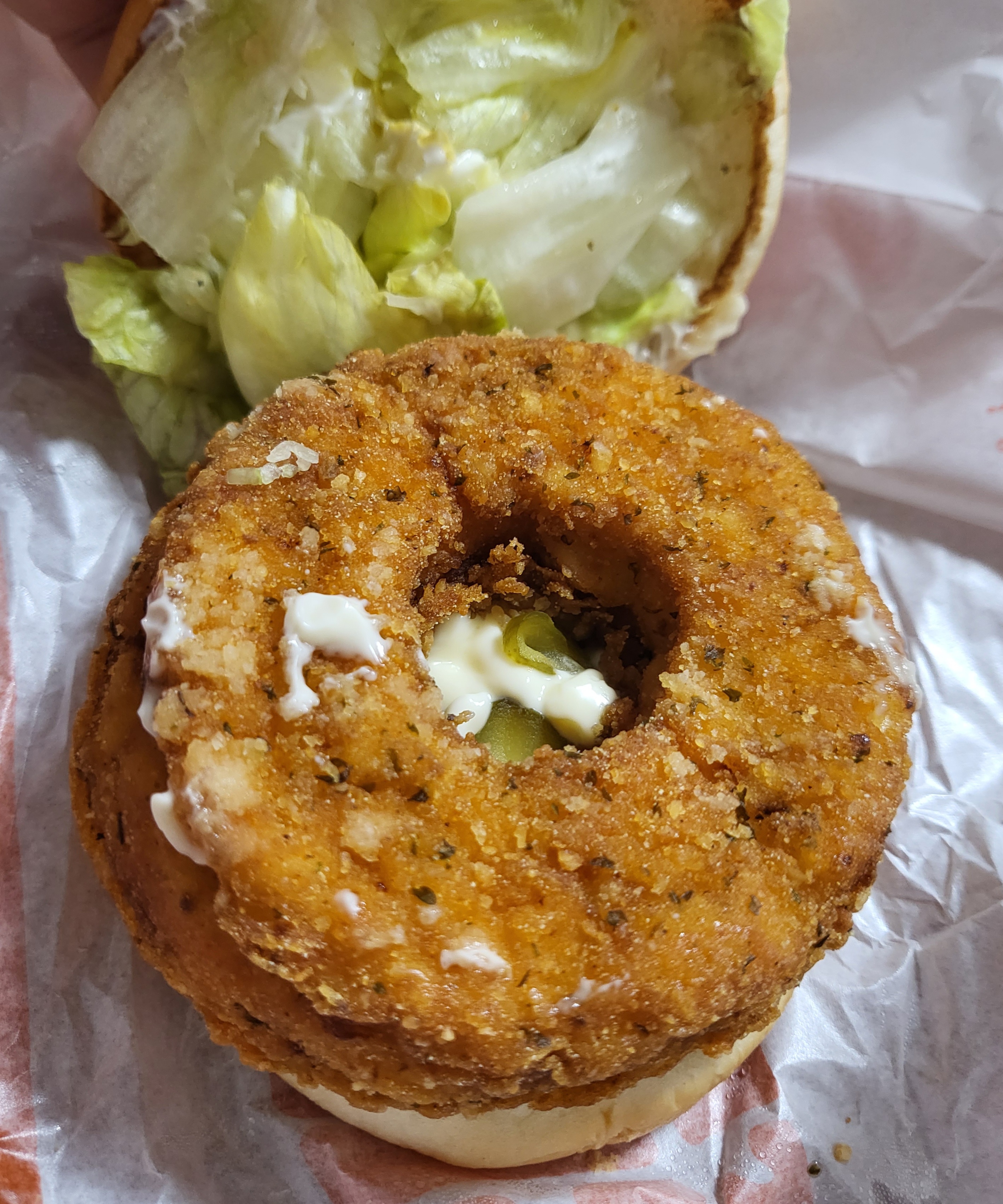 포장지를 뜯고 크리스피 도넛 치킨버거의 안을 살펴보면 빵-피클-마요네즈-치킨 패티-양상추-마요-빵 이렇게 구성돼있습니다.
